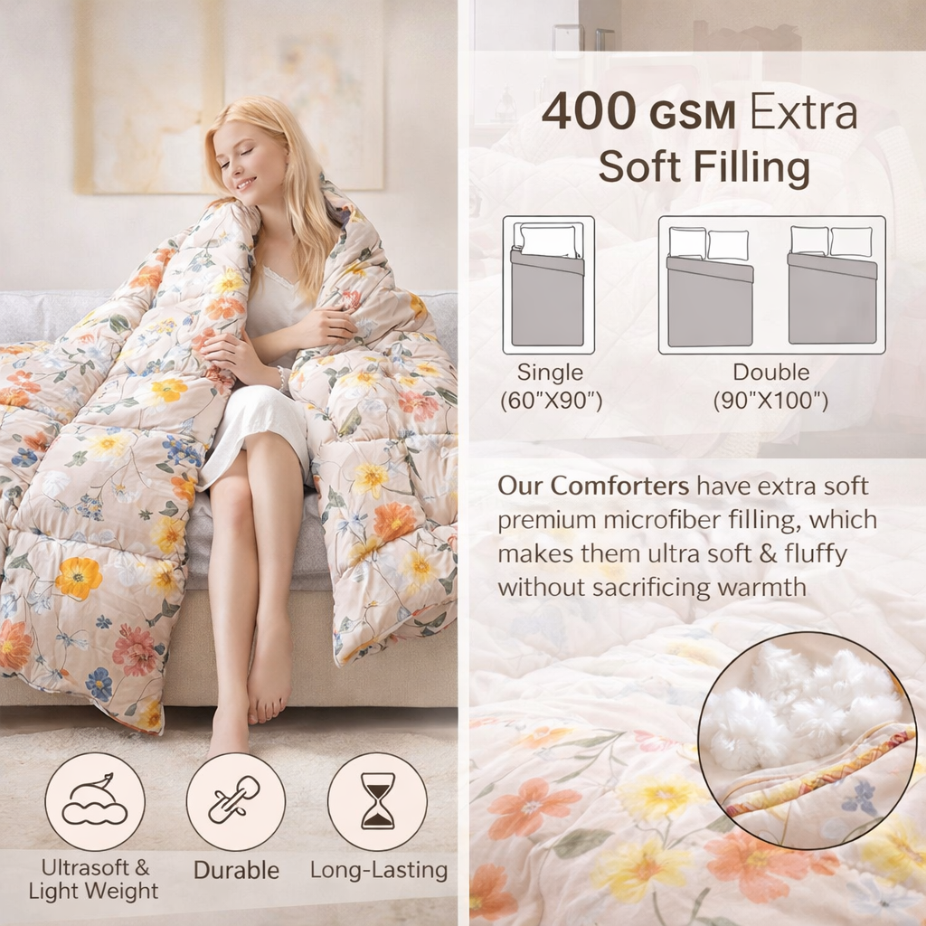 Designed with a beautiful floral print on a warm beige base, this comforter adds a rich and inviting look to your space. The ultra-soft microfiber fabric combined with lightweight filling ensures a perfect balance of comfort and breathability, making it ideal for all-season use (AC & mild winters).